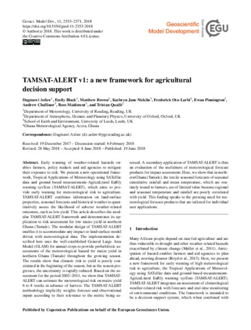 Asfaw, D., Black, E. orcid id iconORCID: https://orcid.org/0000-0003-1344-6186, Brown, M., Nicklin, K. J., Otu-Larbi, F., Pinnington, E., Challinor, A., Maidment, R. orcid id iconORCID: https://orcid.org/0000-0003-2054-3259 and Quaife, T. orcid id iconORCID: https://orcid.org/0000-0001-6896-4613 (2018) TAMSAT-ALERT v1: a new framework for agricultural decision support. Geoscientific Model Development, 11 (6). pp. 2353-2371. ISSN 1991-9603 doi: 10.5194/gmd-11-2353-2018