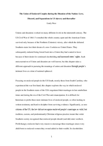 West, E. orcid id iconORCID: https://orcid.org/0000-0003-3444-3814 (2019) The union of enslaved couples during the disunion of the nation: love, discord and separations in US slavery and thereafter. In: Grey, D. and Gregory, J. (eds.) Union and Disunion in the Nineteenth Century. Routledge, London. ISBN 9781138354302