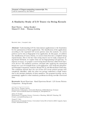 Torres, R., Kunkel, J. M., Dolz, M. F. and Ludwig, T. (2019) A similarity study of I/O traces via string kernels. The Journal of Supercomputing, 75 (12). pp. 7814-7826. ISSN 0920-8542 doi: 10.1007/s11227-018-2471-x