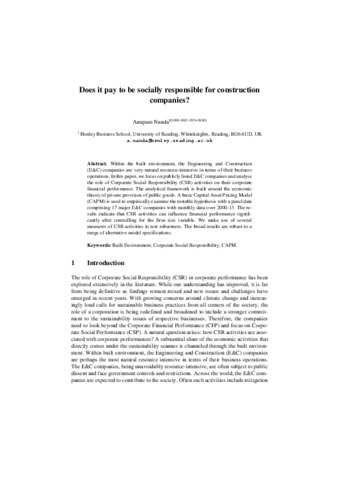 Nanda, A. (2018) Does it pay to be socially responsible for construction companies? In: ICISO 2018, 16th - 18th July 2018, Henley Business School, pp. 248-256. doi: 10.1007/978-3-319-94541-5_25