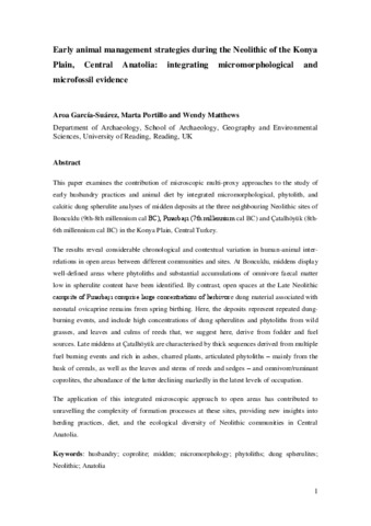 Early animal management strategies during the Neolithic of the Konya Plain, Central Anatolia: integrating micromorphological and microfossil evidence.