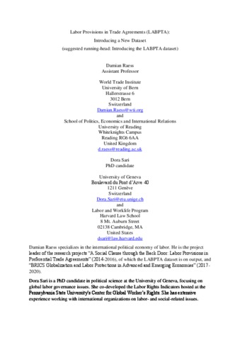 Raess, D. and Sari, D. (2018) Labor provisions in trade agreements (LABPTA): introducing a new dataset. Global Policy, 9 (4). pp. 451-466. ISSN 1758-5899 doi: 10.1111/1758-5899.12577