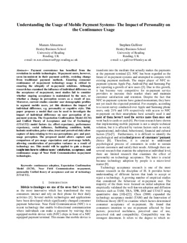 Almazroa, M. and Gulliver, S. orcid id iconORCID: https://orcid.org/0000-0002-4503-5448 (2018) Understanding the usage of Mobile Payment Systems- the impact of personality on the continuance usage. In: 4th International Conference on Information Management (ICIM), 25-27th May 2018, Oxford University. doi: 10.1109/INFOMAN.2018.8392833 (2018 4th International Conference on Information Management (ICIM))