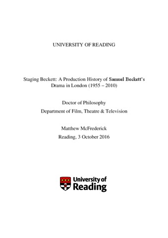 This study presents the first performance history of Samuel Beckett’s drama in London theatres. The study focuses on a selection of professional productions of Beckett’s dramatic canon and assesses the impact these performances had on London and British theatre cultures between 1955 and 2010. Since the British premiere of Waiting for Godot, Beckett’s oeuvre has been staged across a variety of London theatres and contexts, ranging from the Riverside Studios in Hammersmith to the Theatre Royal Stratford East. The performance histories of Beckett’s plays represent a neglected facet of Beckett studies, but through research undertaken for the Staging Beckett Database – a searchable data model for Beckett performances staged in the UK and Ireland – a broad tradition of staging Beckett in the British Isles has been discovered. Through the support of these records, performance histories, theatre historiography and performance archives, the study shows how Beckett’s drama featured in key London theatres during prominent moments in British theatre history in a series of landmark and lesser known productions and seasons. By means of a chronological structure, this account examines the factors that contributed to Beckett’s role in metropolitan theatre cultures, discussing how his theatre was created and received and the legacies or significance of his drama on the city’s theatrical landscape. Beckett’s evolving stature and the multifunctional role he played in London theatre cultures is reflected in the four chapters that investigate the history. Chapters one and two reveal the key partnerships he established in theatres such as the English Stage Company at the Royal Court and the National Theatre, and the eclectic range of performances from the international productions during the World Theatre Seasons to the multiple presentations of his drama for young theatregoers at the newly started Young Vic. Chapter three examines the development of Beckett’s practice through some of his last productions staged or rehearsed at the Royal Court, Riverside Studios and the National Theatre. The final chapter discusses performances post-Beckett, when his drama proliferated across London, from West End productions with star actors to Festivals celebrating his entire canon.