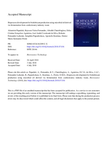 Papadaki, A., Vieira Fernandes, K., Chatzifragkou, A. orcid id iconORCID: https://orcid.org/0000-0002-9255-7871, Gonçalves Aguieiras, E. C., Cavalcanti da Silva, J. A., Fernandez-Lafuente, R., Papanikolaou, S., Koutinas, A. and Guimarães Freire, D. M. (2018) Bioprocess development for biolubricant production using microbial oil derived via fermentation from confectionery industry waste. Bioresource Technology, 267. pp. 311-318. ISSN 0960-8524 doi: 10.1016/j.biortech.2018.07.016