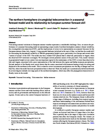 Beverley, J. D., Woolnough, S. J. orcid id iconORCID: https://orcid.org/0000-0003-0500-8514, Baker, L. H. orcid id iconORCID: https://orcid.org/0000-0003-0738-9488, Johnson, S. J. and Weisheimer, A. (2019) The northern hemisphere circumglobal teleconnection in a seasonal forecast model and its relationship to European summer forecast skill. Climate Dynamics, 52 (5-6). pp. 3729-3771. ISSN 0930-7575 doi: 10.1007/s00382-018-4371-4