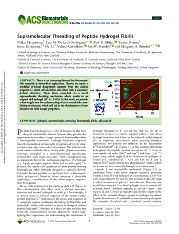 There is an increasing demand for biocompatible materials in biomedical applications. Herein, we report a modified α-helical decapeptide segment from the cardiac troponin C, which self-assembles into fibers with a secondary β-sheet structure. These fibers cross-link via a novel supramolecular threading mechanism which results in an atypical stiff hydrogel (G′ ≈ 13 kPa). In this work, we provide a first insight into the understanding of such remarkable cross-linking mechanism, which will aid in the development of new biomaterials with unique properties.