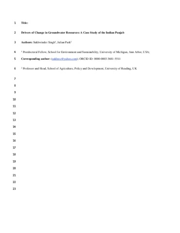 Singh, S. and Park, J. orcid id iconORCID: https://orcid.org/0000-0002-3430-9052 (2018) Drivers of change in groundwater resources: a case study of the Indian Punjab. Food Security, 10 (4). pp. 965-979. ISSN 1876-4517 doi: 10.1007/s12571-018-0823-2