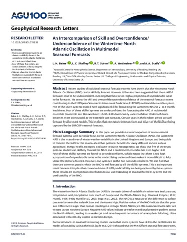 Baker, L. H. orcid id iconORCID: https://orcid.org/0000-0003-0738-9488, Shaffrey, L. C. orcid id iconORCID: https://orcid.org/0000-0003-2696-752X, Sutton, R. T. orcid id iconORCID: https://orcid.org/0000-0001-8345-8583, Weisheimer, A. and Scaife, A. A. (2018) An intercomparison of skill and overconfidence/underconfidence of the wintertime North Atlantic Oscillation in multimodel seasonal forecasts. Geophysical Research Letters, 45 (15). pp. 7808-7817. ISSN 0094-8276 doi: 10.1029/2018GL078838