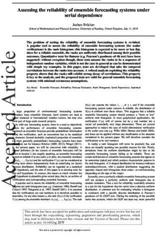 Bröcker, J. (2018) Assessing the reliability of ensemble forecasting systems under serial dependence. Quarterly Journal of the Royal Meteorological Society, 144 (717). pp. 2666-2675. ISSN 1477-870X doi: 10.1002/qj.3379