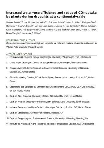Increased water-use efficiency and reduced CO2 uptake by plants during droughts at a continental-scale.