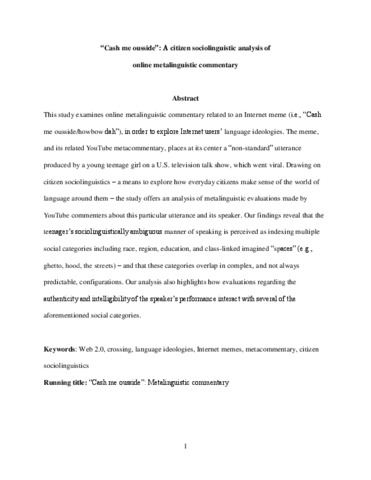 This study examines online metalinguistic commentary related to an Internet meme (i.e., “Cash me ousside/howbow dah”), in order to explore Internet users’ language ideologies. The meme, and its related YouTube metacommentary, places at its center a “non-standard” utterance produced by a young teenage girl on a U.S. television talk show, which went viral. Drawing on citizen sociolinguistics – a means to explore how everyday citizens make sense of the world of language around them – the study offers an analysis of metalinguistic evaluations made by YouTube commenters about this particular utterance and its speaker. Our findings reveal that the teenager’s sociolinguistically ambiguous manner of speaking is perceived as indexing multiple social categories including race, region, education, and class-linked imagined “spaces” (e.g., ghetto, hood, the streets) – and that these categories overlap in complex, and not always predictable, configurations. Our analysis also highlights how evaluations regarding the authenticity and intelligibility of the speaker’s performance interact with several of the aforementioned social categories.