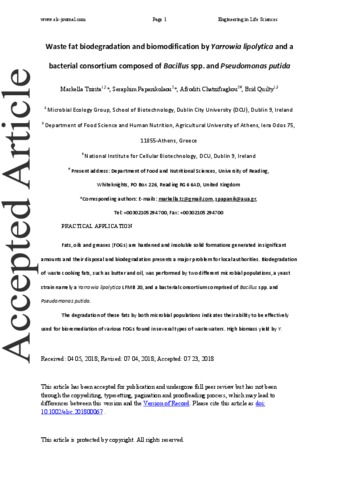 Waste fat biodegradation and biomodification by Yarrowia lipolytica and a bacterial consortium composed of Bacillus spp. and Pseudomonas putida