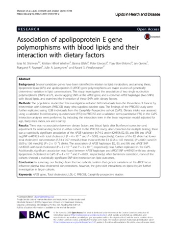 Several candidate genes have been identified in relation to lipid metabolism, and among these, lipoprotein lipase (LPL) and apolipoprotein E (APOE) gene polymorphisms are major sources of genetically determined variation in lipid concentrations. This study investigated the association of two single nucleotide polymorphisms (SNPs) at LPL, seven tagging SNPs at the APOE gene, and a common APOE haplotype (two SNPs) with blood lipids, and examined the interaction of these SNPs with dietary factors. METHODS: The population studied for this investigation included 660 individuals from the Prevention of Cancer by Intervention with Selenium (PRECISE) study who supplied baseline data. The findings of the PRECISE study were further replicated using 1238 individuals from the Caerphilly Prospective cohort (CaPS). Dietary intake was assessed using a validated food-frequency questionnaire (FFQ) in PRECISE and a validated semi-quantitative FFQ in the CaPS. Interaction analyses were performed by including the interaction term in the linear regression model adjusted for age, body mass index, sex and country. RESULTS: There was no association between dietary factors and blood lipids after Bonferroni correction and adjustment for confounding factors in either cohort. In the PRECISE study, after correction for multiple testing, there was a statistically significant association of the APOE haplotype (rs7412 and rs429358; E2, E3, and E4) and APOE tagSNP rs445925 with total cholesterol (P = 4 × 10- 4 and P = 0.003, respectively). Carriers of the E2 allele had lower total cholesterol concentration (5.54 ± 0.97 mmol/L) than those with the E3 (5.98 ± 1.05 mmol/L) (P = 0.001) and E4 (6.09 ± 1.06 mmol/L) (P = 2 × 10- 4) alleles. The association of APOE haplotype (E2, E3, and E4) and APOE SNP rs445925 with total cholesterol (P = 2 × 10- 6 and P = 3 × 10- 4, respectively) was further replicated in the CaPS. Additionally, significant association was found between APOE haplotype and APOE SNP rs445925 with low density lipoprotein cholesterol in CaPS (P = 4 × 10- 4 and P = 0.001, respectively). After Bonferroni correction, none of the cohorts showed a statistically significant SNP-diet interaction on lipid outcomes. CONCLUSION: In summary, our findings from the two cohorts confirm that genetic variations at the APOE locus influence plasma total cholesterol concentrations, however, the gene-diet interactions on lipids require further investigation in larger cohorts.