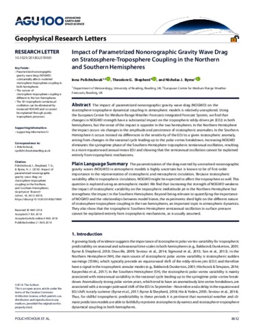 Polichtchouk, I., Shepherd, T. G. orcid id iconORCID: https://orcid.org/0000-0002-6631-9968 and Byrne, N. J. (2018) Impact of parametrized nonorographic gravity wave drag on stratosphere-troposphere coupling in the northern and southern hemispheres. Geophysical Research Letters, 45 (16). pp. 8612-8618. ISSN 0094-8276 doi: 10.1029/2018GL078981