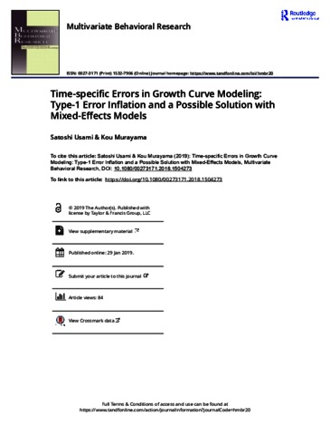 Usami, S. and Murayama, K. (2018) Time-specific errors in growth curve modeling: type-1 error inflation and a possible solution with mixed-effects models. Multivariate Behavioral Research, 53 (6). pp. 876-897. ISSN 1532-7906 doi: 10.1080/00273171.2018.1504273