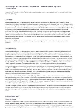 Holzke, J. and Waller, J. (2018) Improving aircraft-derived temperature observations using data assimilation. Reinvention: an International Journal of Undergraduate Research, 11 (2). ISSN 1755-7429