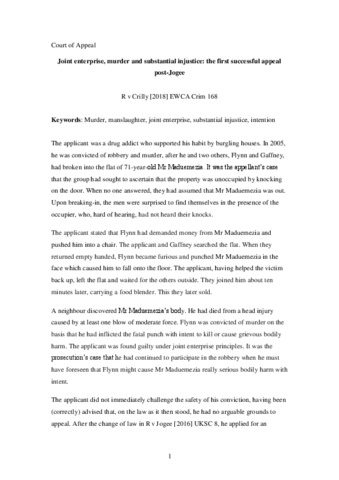 Krebs, B. (2018) Joint enterprise, murder and substantial injustice: the first successful appeal post-Jogee (case comment). Journal of Criminal Law, 82 (3). pp. 209-211. ISSN 1740-5580 doi: 10.1177/0022018318779644