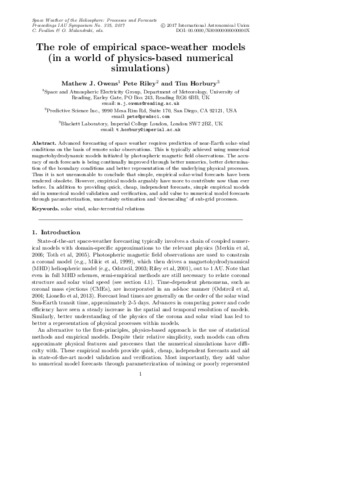 Advanced forecasting of space weather requires prediction of near-Earth solar-wind conditions on the basis of remote solar observations. This is typically achieved using numerical magnetohydrodynamic models initiated by photospheric magnetic field observations. The accuracy of such forecasts is being continually improved through better numerics, better determination of the boundary conditions and better representation of the underlying physical processes. Thus it is not unreasonable to conclude that simple, empirical solar-wind forecasts have been rendered obsolete. However, empirical models arguably have more to contribute now than ever before. In addition to providing quick, cheap, independent forecasts, simple empirical models aid in numerical model validation and verification, and add value to numerical model forecasts through parameterization, uncertainty estimation and ‘downscaling’ of sub-grid processes.