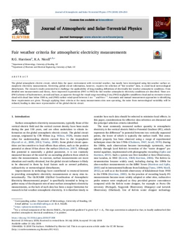 The global atmospheric electric circuit, which links the space environment with terrestrial weather, has mostly been investigated using fair-weather surface atmospheric electricity measurements. Retrieving global circuit information, however, requires the selection of “fair weather” data, to avoid local meteorological disturbances. The research results presented here challenge the applicability of long-standing definitions of electrically fair weather atmospheric conditions. From detailed new measurements and theory, three improved requirements (FW1 to FW3) for fair weather atmospheric electricity conditions are described. These are: (FW1) absence of hydrometeors, aerosol and haze, as apparent through the visual range exceeding 2 km, (FW2) negligible cumuliform cloud and no extensive stratus cloud with cloud base below 1500 m, and (FW3) surface wind speed between 1 m s−1 and 8 m s−1. Automatic and manual measurement approaches to identifying these requirements are given. Through applying these criteria at the many measurements sites now operating, the noise from meteorological variability will be reduced, leading to data more representative of the global electric circuit.