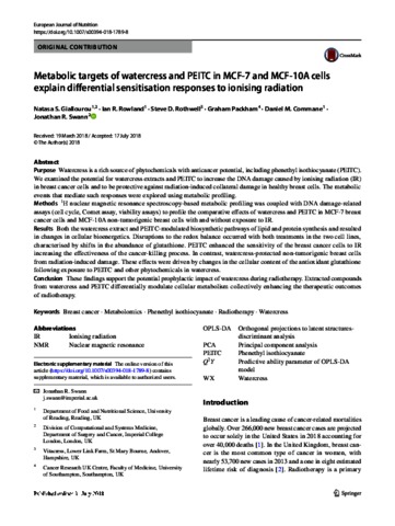 Giallourou, N. S., Rowland, I. R., Rothwell, S. D., Packham, G., Commane, D. M. and Swann, J. R. (2019) Metabolic targets of watercress and PEITC in MCF-7 and MCF-10A cells explain differential sensitisation responses to ionising radiation. European Journal of Nutrition, 58 (6). pp. 2377-2391. ISSN 1436-6215 doi: 10.1007/s00394-018-1789-8