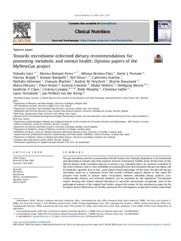 Sanz, Y., Romaní-Perez, M., Benítez-Páez, A., Portune, K. J., Brigidi, P., Rampelli, S., Dinan, T., Stanton, C., Delzenne, N., Blachier, F., Neyrinck, A. M., Beaumont, M., Olivares, M., Holzer, P., Günther, K., Wolters, M., Ahrens, W., Claus, S. P., Campoy, C., Murphy, R., Sadler, C., Fernández, L. and van der Kamp, J.-W. (2018) Towards microbiome-informed dietary recommendations for promoting metabolic and mental health: opinion papers of the MyNewGut project. Clinical Nutrition, 37 (6). pp. 2191-2197. ISSN 0261-5614 doi: 10.1016/j.clnu.2018.07.007