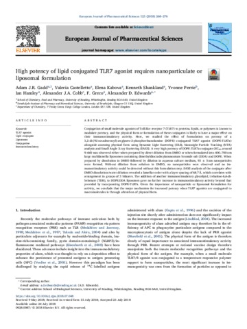 Gadd, A. J. R., Castelletto, V., Kabova, E., Shankland, K. orcid id iconORCID: https://orcid.org/0000-0001-6566-0155, Perrie, Y., Hamley, I. orcid id iconORCID: https://orcid.org/0000-0002-4549-0926, Cobb, A. J. A., Greco, F. and Edwards, A. D. orcid id iconORCID: https://orcid.org/0000-0003-2369-989X (2018) High potency of lipid conjugated TLR7 agonist requires nanoparticulate or liposomal formulation. European Journal of Pharmaceutical Sciences, 123. pp. 268-276. ISSN 0928-0987 doi: 10.1016/j.ejps.2018.07.048