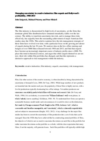 Pokorny, M., Miskell, P. and Sedgwick, J. (2019) Managing uncertainty in creative industries: film sequels and Hollywood's profitability, 1988-2015. Competition and Change, 23 (1). pp. 23-46. ISSN 1477-2221 doi: 10.1177/1024529418797302