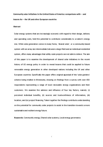 Solar energy systems that are increasingly economic with regard to their design, delivery and operating costs, hold the potential to contribute considerably to a nation’s energy mix. While solar generation comes in many forms, ‘shared solar’, or a community-based system with an array size intermediate between a large-field and an individual residential system, offers many advantages that utility-scale projects are not able to deliver. The aim of this paper is to examine the development of shared solar initiatives in the recent history of US energy policy in order to reveal lessons that could be applied to future renewable energy generation in other developed nations including the UK and other European countries. Specifically the paper offers original appraisal of the ‘solar gardens’ scheme being trialled in Minnesota, drawing on findings from a survey with over 650 respondents representing a range of local renewable energy organizations and their customers. We examine the salience and influence of four key factors, namely: (i) perceived individual benefits; (ii) sources and trustworthiness of information; (iii) location; and (iv) project financing. Taken together the findings contribute understanding on the potential for community solar projects to assist in the transition towards a more sustainable and resilient energy future.