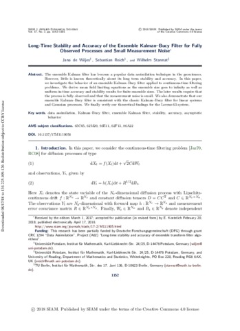de Wiljes, J., Reich, S. and Stannat, W. (2018) Long-time stability and accuracy of the ensemble Kalman--Bucy filter for fully observed processes and small measurement noise. SIAM Journal on Applied Dynamical Systems, 17 (2). pp. 1152-1181. ISSN 1536-0040 doi: 10.1137/17M1119056
