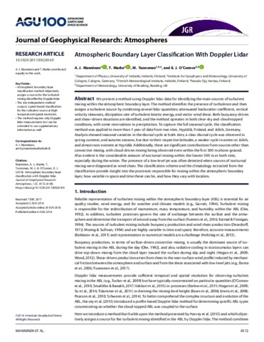 Manninen, A. J., Marke, T., Tuononen, M. and O'Connor, E. J. (2018) Atmospheric boundary layer classification with Doppler lidar. Journal of Geophysical Research: Atmospheres, 123 (15). pp. 8172-8189. ISSN 2169-8996 doi: 10.1029/2017jd028169