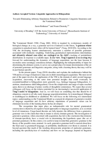 Rothman, J. and Chomsky, N. (2018) Towards eliminating arbitrary stipulations related to parameters: linguistic innateness and the variational model. Linguistic Approaches to Bilingualism, 8 (6). pp. 764-769. ISSN 1879-9272 doi: 10.1075/lab.18075.rot