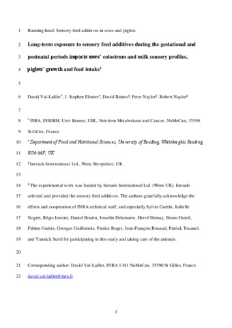 Val-Laillet, D., Elmore, J. S. orcid id iconORCID: https://orcid.org/0000-0002-2685-1773, Baines, D., Naylor, P. and Naylor, R. (2018) Long-term exposure to sensory feed additives during the gestational and postnatal periods impacts sows’ colostrum and milk sensory profiles, piglets’ growth and feed intake. Journal of Animal Science, 96 (8). pp. 3233-3248. ISSN 0021-8812 doi: 10.1093/jas/sky171