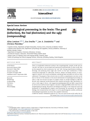 Leminen, A., Leminen, M., Kujala, T., & Shtyrov, Y. (2013). Neural dynamics of inflectional and derivational morphology processing in the human brain. Cortex, 49, 2758-2771.