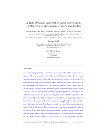 A rule dynamics approach to event detection in Twitter with its application to sports and politics.