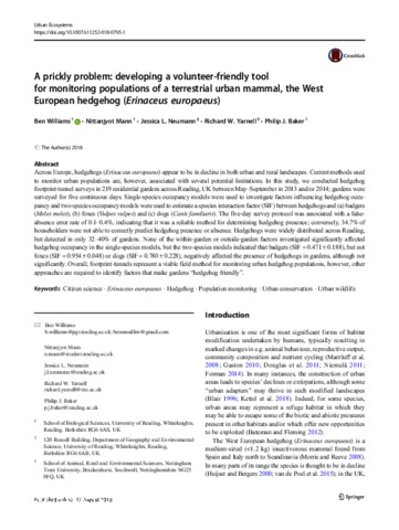Williams, B., Mann, N., Neumann, J. L. orcid id iconORCID: https://orcid.org/0000-0003-3244-2578, Yarnell, R. W. and Baker, P. J. (2018) A prickly problem: developing a volunteer-friendly tool for monitoring populations of a terrestrial urban mammal, the West European hedgehog (Erinaceus europaeus). Urban Ecosystems, 21 (6). pp. 1075-1086. ISSN 1083-8155 doi: 10.1007/s11252-018-0795-1