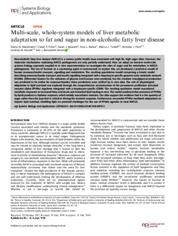 Maldonado, E. M., Fisher, C. P., Mazzatti, D. J., Barber, A. L., Tindall, M. J., Plant, N. J., Kierzek, A. M. and Moore, J. B. (2018) Multi-scale, whole-system models of liver metabolic adaptation to fat and sugar in non-alcoholic fatty liver disease. NPJ Systems Biology and Applications, 4. 33. ISSN 2056-7189 doi: 10.1038/s41540-018-0070-3