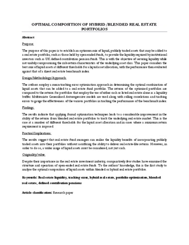 Purpose: The purpose of this paper is to establish an optimum mix of liquid, publicly traded assets that may be added to a real estate portfolio, such as those held by open-ended funds, to provide the liquidity required by institutional investors such as UK defined contribution pension funds. This is with the objective of securing liquidity while not unduly compromising the risk-return characteristics of the underlying asset class. This paper considers the best mix of liquid assets at different thresholds for a liquid asset allocation, with the performance then evaluated against that of a direct real estate benchmark index. Design/Methodology/Approach: The authors employ a mean-tracking error optimisation approach in determining the optimal combination of liquid assets that can be added to a real estate fund portfolio. The returns of the optimised portfolios are compared to the returns for portfolios that employ the use of either cash or listed real estate alone as a liquidity buffer. Multivariate Generalised Autoregressive models are used along with rolling correlations and tracking errors to gauge the effectiveness of the various portfolios in tracking the performance of the benchmark index. Findings: The results indicate that applying formal optimisation techniques leads to a considerable improvement in the ability of the returns from blended real estate portfolios to track the underlying real estate market. This is the case at a number of different thresholds for the liquid asset allocation and in cases where a minimum return requirement is imposed. Practical Implications: The results suggest that real estate fund managers can realise the liquidity benefits of incorporating publicly traded assets into their portfolios without sacrificing the ability to deliver real estate-like returns. However, in order to do so, a wider range of liquid assets must be considered, not just cash. Originality/value: Despite their importance in the real estate investment industry, comparatively few studies have examined the structure and operation of open-ended real estate funds. To the authors’ knowledge, this is the first study to analyse the optimal composition of liquid assets within blended or hybrid real estate portfolios.