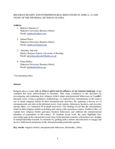 Religion plays a major role in Africa’s polity and its influence on the business landscape of the continent has been acknowledged in literature. This study contributes to the discourse by investigating and explaining how religious beliefs shape entrepreneurial behaviours in Uganda’s informal sector. Using a qualitative methodology, we explored how entrepreneurs in the context use or adopt religious beliefs in their entrepreneurial activities. By spanning a diverse set of entrepreneurial activities in the informal sector- food vendors, fabricators, hawkers, and recyclers among others, we conducted 49 in-depth interviews. Our findings reveal that the entrepreneurs relied on their religious beliefs in defining and coping with a penurious context. Further to this, we explain how religious beliefs galvanize business behaviours and calibrate the entrepreneurial identities of respondents in the context. To facilitate future work, the study highlights how knowledge gaps in the cultural and social setup of the informal economy will produce new insights in entrepreneurship research. It concludes by guiding policy makers and educators to engage and involve faith based institutions in the entrepreneurship promotion agenda.