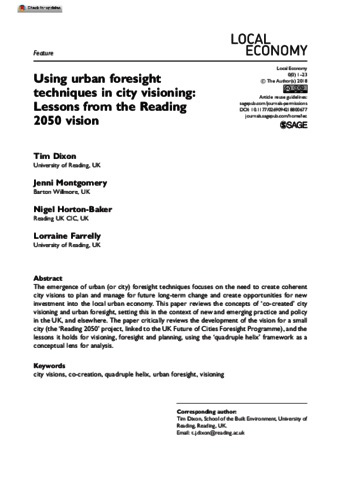 The emergence of urban (or city) foresight techniques focuses on the need to create coherent city visions to plan and manage for future long-term change and create opportunities for new investment into the local urban economy. This paper reviews the concepts of ‘co-created’ city visioning and urban foresight, setting this in the context of new and emerging practice and policy in the UK, and elsewhere. The paper critically reviews the development of the vision for a small city (the ‘Reading 2050’ project, linked to the UK Future of Cities Foresight Programme), and the lessons it holds for visioning, foresight and planning, using the ‘quadruple helix’ framework as a conceptual lens for analysis.