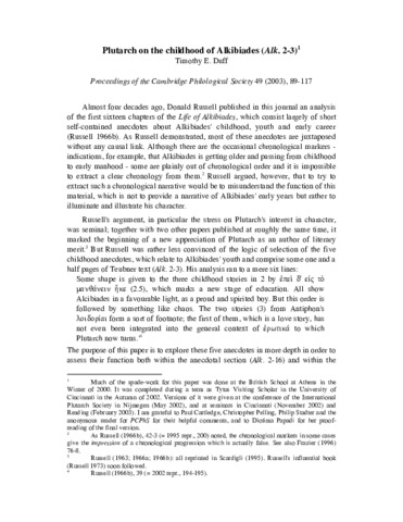 Duff, T. E. orcid id iconORCID: https://orcid.org/0000-0002-7000-4950 (2003) Plutarch on the childhood of Alcibiades. Proceedings of the Cambridge Philological Society, 49. pp. 89-117. ISSN 1750-2705 doi: 10.1017/S0068673500000961