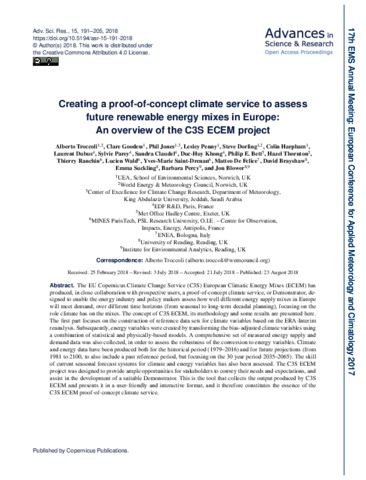 The EU Copernicus Climate Change Service (C3S) European Climatic Energy Mixes (ECEM) has produced, in close collaboration with prospective users, a proof-of-concept climate service, or Demonstrator, designed to enable the energy industry and policy makers assess how well different energy supply mixes in Europe will meet demand, over different time horizons (from seasonal to long-term decadal planning), focusing on the role climate has on the mixes. The concept of C3S ECEM, its methodology and some results are presented here. The first part focuses on the construction of reference data sets for climate variables based on the ERA-Interim reanalysis. Subsequently, energy variables were created by transforming the bias-adjusted climate variables using a combination of statistical and physically-based models. A comprehensive set of measured energy supply and demand data was also collected, in order to assess the robustness of the conversion to energy variables. Climate and energy data have been produced both for the historical period (1979–2016) and for future projections (from 1981 to 2100, to also include a past reference period, but focusing on the 30 year period 2035–2065). The skill of current seasonal forecast systems for climate and energy variables has also been assessed. The C3S ECEM project was designed to provide ample opportunities for stakeholders to convey their needs and expectations, and assist in the development of a suitable Demonstrator. This is the tool that collects the output produced by C3S ECEM and presents it in a user-friendly and interactive format, and it therefore constitutes the essence of the C3S ECEM proof-of-concept climate service.