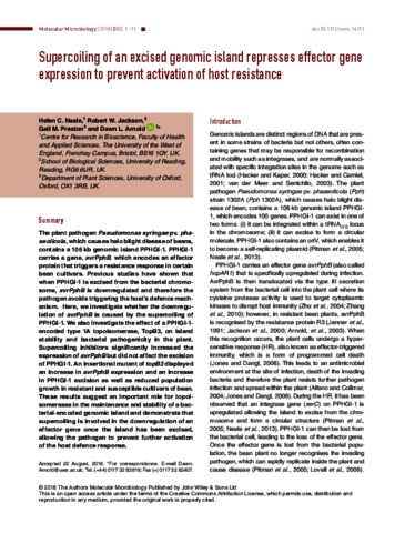 Neale, H. C., Jackson, R. W., Preston, G. M. and Arnold, D. L. (2018) Supercoiling of an excised genomic island represses effector gene expression to prevent activation of host resistance. Molecular Microbiology, 110 (3). pp. 444-454. ISSN 0950382X doi: 10.1111/mmi.14111