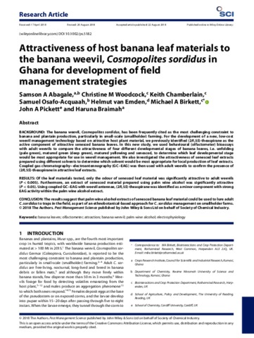Abagale, S. A., Woodcock, C. M., Chamberlain, K., Osafo-Acquaah, S., van Emden, H. F., Birkett, M. A., Pickett, J. A. and Braimah, H. (2019) Attractiveness of host banana leaf materials to the banana weevil, Cosmopolites sordidus in Ghana for development of field management strategies. Pest Management Science, 75 (2). pp. 549-555. ISSN 1526-4998 doi: 10.1002/ps.5182