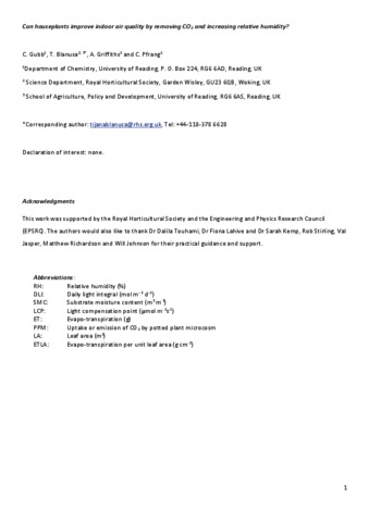 Gubb, C., Blanusa, T., Griffiths, A. and Pfrang, C. (2018) Can houseplants improve indoor air quality by removing CO2 and increasing relative humidity? Air Quality, Atmosphere & Health, 11 (10). pp. 1191-1201. ISSN 1873-9318 doi: 10.1007/s11869-018-0618-9