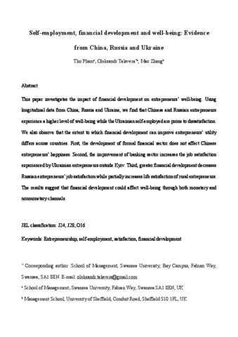 Pham, T., Talavera, O. and Zhang, M. (2018) Self-employment, financial development and well-being: evidence from China, Russia and Ukraine. Journal of Comparative Economics, 46 (3). pp. 754-769. ISSN 0147-5967 doi: 10.1016/j.jce.2018.07.006