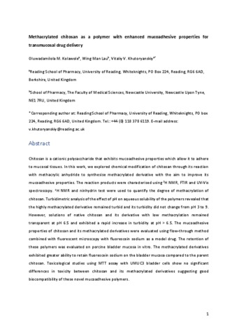 Kolawole, O. M., Lau, W. M. and Khutoryanskiy, V. V. orcid id iconORCID: https://orcid.org/0000-0002-7221-2630 (2018) Methacrylated chitosan as a polymer with enhanced mucoadhesive properties for transmucosal drug delivery. International Journal of Pharmaceutics, 550 (1-2). pp. 123-129. ISSN 0378-5173 doi: 10.1016/j.ijpharm.2018.08.034