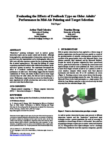 “Hands-free” pointing techniques used in mid-air gesture interaction require precise motor control and dexterity. Although being applied in a growing number of interaction contexts over the past few years, this input method can be challenging for older users (60+ years old) who experience natural decline in pointing abilities due to natural ageing process. We report the findings of a target acquisition experiment in which older adults had to perform “pointand- select” gestures in mid-air. The experiment investigated the effect of 6 feedback conditions on pointing and selection performance of older users. Our findings suggest that the bimodal combination of Visual and Audio feedback lead to faster target selection times for older adults, but did not lead to making less errors. Furthermore, target location on screen was found to play a more important role in both selection time and accuracy of pointand- select tasks than feedback type.