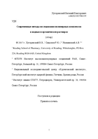 Khutoryanskiy, V. V. orcid id iconORCID: https://orcid.org/0000-0002-7221-2630, Smyslov, R. Y. and Yakimansky, A. V. (2018) Modern methods for studying polymer complexes in aqueous and organic solutions. Polymer Science Series A, 60 (5). pp. 553-576. ISSN 1555-6107 doi: 10.1134/S0965545X18050085