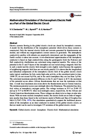 Electric currents flowing in the Global Electric Circuit are closed by ionospheric currents. A model for the distribution of the ionospheric potential which drives these currents is constructed. Only the internal electric fields and currents generated by thunderstorms are studied, and without any magnetospheric current sources or generators. The atmospheric conductivity profiles with altitude are empirically determined, and the topography of the Earth’s surface is taken into account. A two-dimensional approximation of the ionospheric conductor is based on high conductivities along the geomagnetic field; the Pedersen and Hall conductivity distributions are calculated using the empirical models. The values of the potential in the E- and F-layers of the ionosphere are not varied along a magnetic field line in such a model and the electric field strength is only slightly varied because the segments of neighboring magnetic field lines are not strictly parallel. It is shown that the longitudinal and latitudinal components of the ionospheric electric field of the Global Electric Circuit under typical conditions for July, under high solar activity, at the considered point in time, 19:00 UT, do not exceed 9 μV/m, and in the sunlit ionosphere they are less than 2 μV/m. The calculated maximum potential difference in the E- and F-layers is 42 V; the maximum of the potential occurs above African thunderstorms that are near the terminator at that time. A weak local maximum also exists above the thunderstorm area in Central America. The minimum potential occurs near midnight above the Himalayas. The potential has identical values at ionospheric conjugate points. The voltage increases to 55V at 23:00 UT and up to 72V at 06:00 UT, when local midnight comes, respectively, for the African and Central American thunderstorm areas. These voltages are about twice as large at solar minimum. With our more realistic ionospheric model, the electric fields are an order of magnitude smaller than those found in the well-known model of Roble and Hays (1979). Our simulations quantitatively support the traditional presentation of the ionosphere as an ideal conductor in models of the Global Electric Circuit, so that our model can be used to investigate UT variations of the Global Electric Circuit.